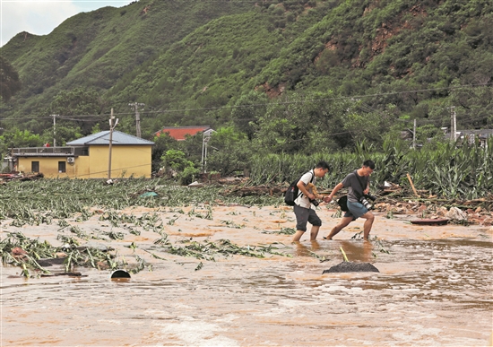 7月29日,北京遭遇暴雨洪澇災(zāi)害,《工人日?qǐng)?bào)》記者王偉偉(右)和竇菲濤一起蹚水前往北京密云區(qū)斷聯(lián)村莊采訪。本報(bào)記者 楊登峰 攝