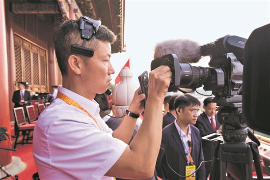 9月3日,紀(jì)念中國(guó)人民抗日戰(zhàn)爭(zhēng)暨世界反法西斯戰(zhàn)爭(zhēng)勝利80周年大會(huì)在京隆重舉行。閱兵儀式開(kāi)始前,在天安門(mén)城樓準(zhǔn)備直播的總臺(tái)記者段德文認(rèn)真擦拭鏡頭。鄂介甫 攝