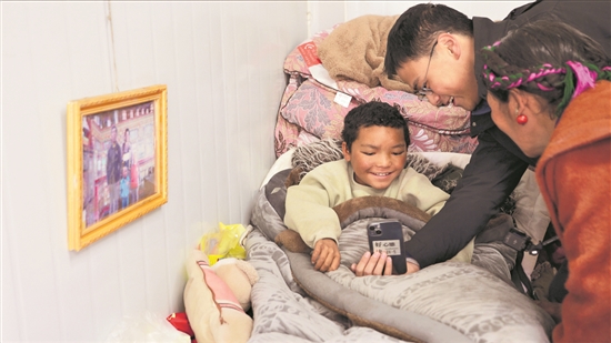 1月28日(除夕),《人民日?qǐng)?bào)》記者徐馭堯在西藏定日地震受災(zāi)群眾居住的板房?jī)?nèi),幫地震中受傷的孩子與支援醫(yī)生視頻連線。次仁羅布 攝
