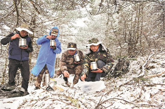 1月8日,云南省麗江市融媒體中心記者趙慶祖(左一)到玉龍雪山采訪時(shí)和玉龍雪山省級(jí)自然保護(hù)區(qū)管護(hù)局工作人員一起在野外用餐。受訪者供圖