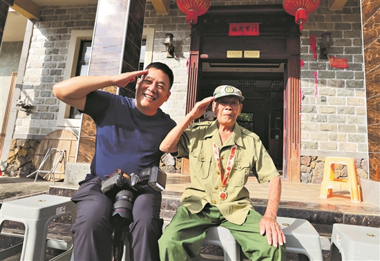 10月24日,重陽(yáng)節(jié)前,轉(zhuǎn)業(yè)軍人、三亞傳媒影視集團(tuán)記者袁永東(圖左)來(lái)到海南省樂(lè)東縣千家鎮(zhèn),采訪年近百歲的老戰(zhàn)士張亞點(diǎn)。陳文武 攝
