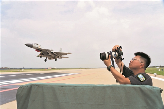 8月25日,《人民畫(huà)報(bào)》記者萬(wàn)全在海軍某基地采訪。岳書(shū)華 攝