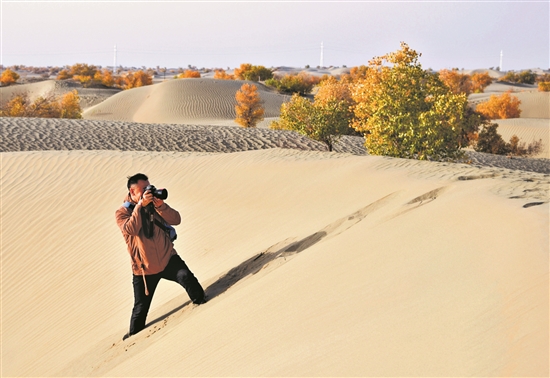 10月24日,《科普時(shí)報(bào)》記者季春紅在新疆塔里木盆地塔克拉瑪干沙漠采訪。趙曉宇 攝