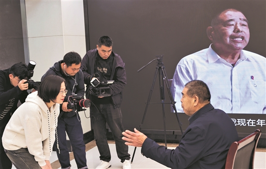 10月25日,在中煤礦建集團(tuán)“猛虎掘進(jìn)隊(duì)”授旗50周年慶?;顒?dòng)現(xiàn)場(chǎng),4名記者采訪全國(guó)勞模、猛虎掘進(jìn)隊(duì)老隊(duì)長(zhǎng)陳登明。張鋒 攝
