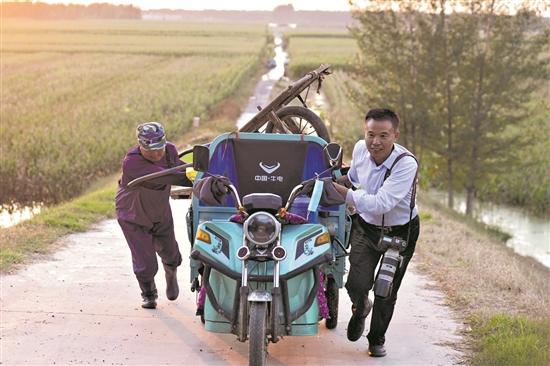 10月13日,山東省淄博市高青縣融媒體中心記者張維堂(右)在采訪路上幫助農(nóng)民推車(chē)搬運(yùn)玉米。李艷梅 攝