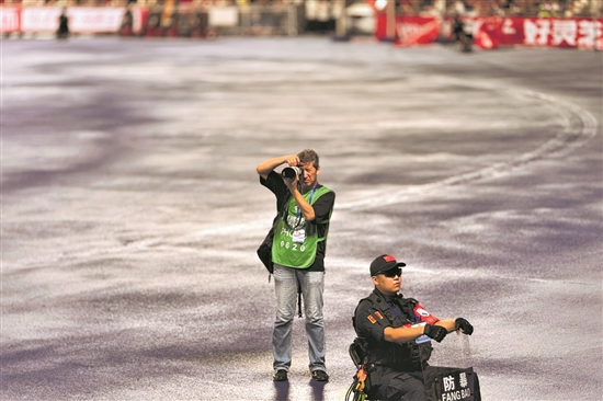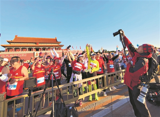 11月2日,《北京青年報(bào)》記者崔峻在天安門(mén)廣場(chǎng)拍攝2025北京馬拉松。張正曄 攝