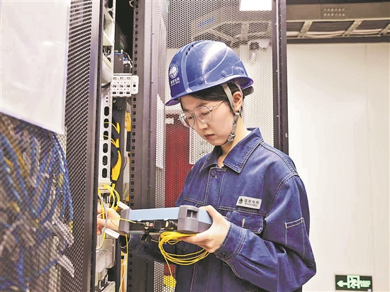 甘肅慶陽,初秋的通信機(jī)房?jī)?nèi),一位身著藍(lán)色工裝的年輕女工正俯身檢查設(shè)備運(yùn)行狀態(tài)。