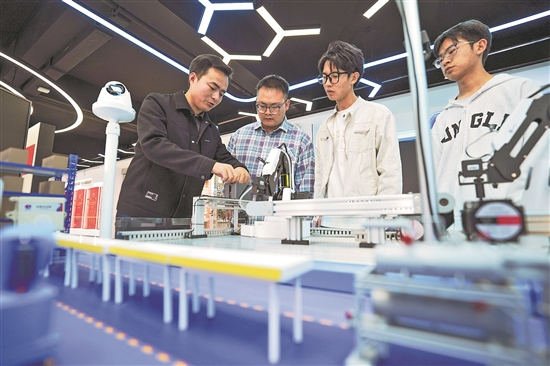 10月29日,鄭棋元(左一)在云南技師學院利用沙盤模型與學生探討研發(fā)項目。