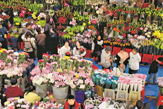 春節(jié)將至,云南省昆明市斗南花卉市場(chǎng)人頭攢動(dòng),人們選購(gòu)年宵花、鮮切花等,各類花卉銷售持續(xù)走俏。