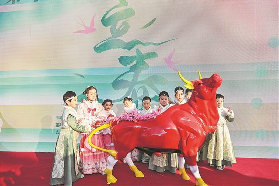 2月4日,“春姑娘”“牛童”手持花枝鞭打春牛。當日是立春,北京市東城區(qū)建國門街道第十九屆立春文化活動在北京古觀象臺舉行?;顒又攸c展示立春時節(jié)“打春?!钡葌鹘y(tǒng)民俗。新華社記者 李鑫 攝