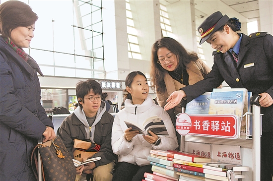 春運期間,中國鐵路上海局集團有限公司鎮(zhèn)江站迎來了返鄉(xiāng)過年的客流,車站因地制宜推出綠色通道、免費充電、解答問詢、便捷換乘引導、關愛重點旅客等服務措施,為旅客送上暖心服務。圖為在“潤之舟”雷鋒服務站工作人員為旅客送上精美圖書,增加“文化充電”,在旅途中靜心閱讀,充滿濃濃的書馨。