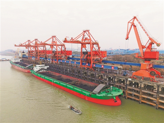 2月7日,在江西煤炭儲備中心,滿載電煤的貨輪??吭陂L江碼頭,抓煤機正在緊張卸船。
