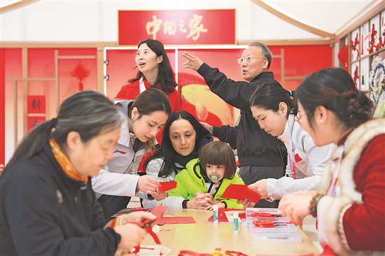 當(dāng)?shù)貢r(shí)間2月6日,中外游客在米蘭中國(guó)之家非遺體驗(yàn)區(qū)體驗(yàn)剪紙。本報(bào)特派記者 吳凡 攝
