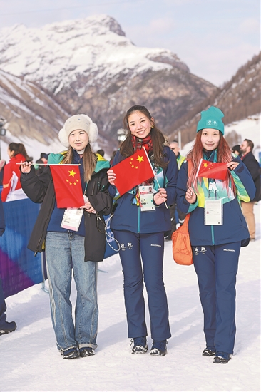 當(dāng)?shù)貢r(shí)間2月9日,3名華人華僑志愿者在利維尼奧小鎮(zhèn)的冬奧會(huì)賽場(chǎng)上。本報(bào)特派記者 吳凡 攝