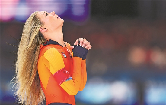 荷蘭選手尤塔·萊爾丹在比賽后慶祝,她以打破奧運紀錄的成績獲得速度滑冰女子1000米冠軍。 新華社記者 杜瀟逸 攝
