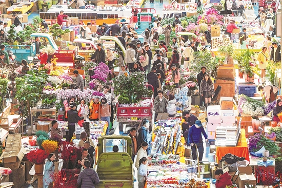 2月10日,人們在云南省昆明市斗南花卉市場內(nèi)選購鮮花。
