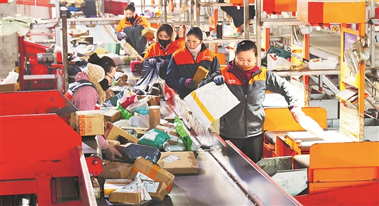 2月12日,江蘇省連云港市公共配送中心一家快遞物流公司,工作人員正在分揀年貨快遞包裹。春節(jié)將至,年貨快遞包裹迎來發(fā)送高峰,連云港市各大快遞物流公司一派繁忙景象。本報通訊員 耿玉和 攝