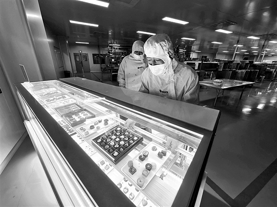 圖為近日,天津市濱海新區(qū)太平鎮(zhèn)的一家巧克力生產(chǎn)企業(yè)車間,工作人員將制作好的巧克力放在展示柜中。