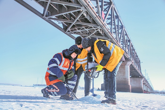中國鐵路哈爾濱局集團(tuán)有限公司齊齊哈爾工務(wù)段水文測量組負(fù)責(zé)管內(nèi)197座橋和400個涵洞的水文監(jiān)測工作。每年春運(yùn),班組都要在鐵路大橋的橋墩附近選取32個監(jiān)測點(diǎn),用鉆冰機(jī)鉆出深近1米的冰洞,用塔尺測量墩臺基礎(chǔ)沖刷、河床變化等基礎(chǔ)數(shù)據(jù),保證橋梁安全穩(wěn)定。劉楊 攝