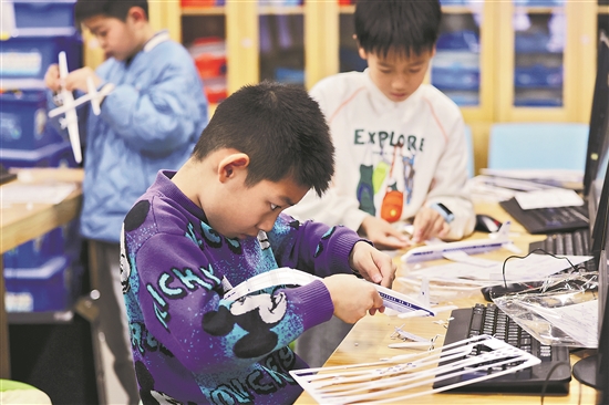 2月25日,孩子們?cè)诒本┛茖W(xué)中心學(xué)習(xí)組裝渦輪螺旋槳飛機(jī)。