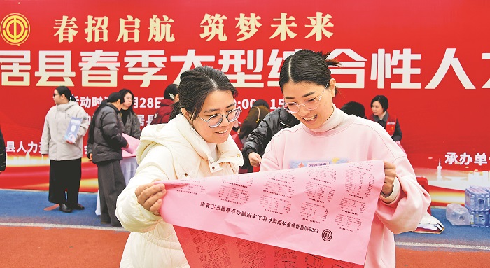 2月28日,求職者在浙江省臺(tái)州市仙居縣春季大型綜合性人才招聘會(huì)上了解就業(yè)信息。當(dāng)日,仙居縣總工會(huì)、縣人社局聯(lián)合在該縣紅旗廣場(chǎng)舉行春季大型綜合性人才招聘會(huì),當(dāng)?shù)?60多家優(yōu)質(zhì)企業(yè)提供3500多個(gè)職位。本報(bào)通訊員 王華斌 攝