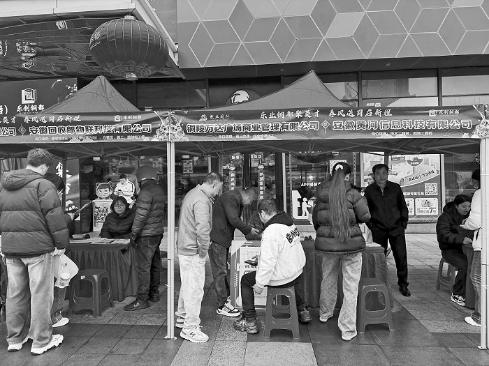 2月24日上午,安徽省銅陵市在位于市中心的萬達(dá)廣場(chǎng)舉辦春風(fēng)行動(dòng)專場(chǎng)招聘會(huì)暨創(chuàng)業(yè)集市。這場(chǎng)開年“大集”提供了2000多個(gè)崗位?;顒?dòng)現(xiàn)場(chǎng),銅峰電子、旭創(chuàng)科技等多家銅陵市重點(diǎn)產(chǎn)業(yè)鏈企業(yè)的招聘展位一字排開,不少展位前擠滿了求職咨詢?nèi)巳?。本?bào)記者 陳華 本報(bào)通訊員 路璐 攝