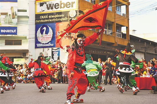 近日,中國廣東普寧泥溝英歌隊的表演者在泰國春武里府舊罔縣演出。