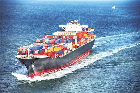 2月3日,山東青島港,一艘裝滿集裝箱的貨輪駛出港口。視覺中國供圖