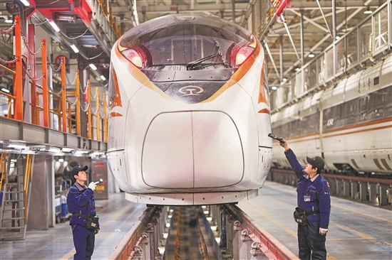 1月1日凌晨,地勤機械師在南京動車段南京南動車運用所檢修庫里檢修動車。本報通訊員 方東旭 攝