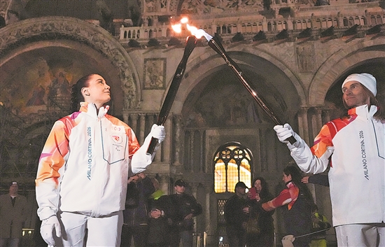 當?shù)貢r間3月4日,米蘭-科爾蒂納冬殘奧會火炬?zhèn)鬟f在意大利威尼斯舉行。圖為當?shù)貢r間3月4日,火炬手彼得(右)與火炬手維拉在威尼斯圣馬可大教堂前進行火炬交接。