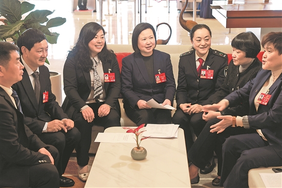 安徽全椒陳淺綜合養(yǎng)殖總場場長劉茜代表(右一)針對超齡農(nóng)民工多從事季節(jié)性、臨時性用工,勞動關(guān)系不穩(wěn)定,社保參保繳費存在不便、權(quán)益保障難以全面覆蓋的問題,提出優(yōu)化靈活參保渠道、完善適配季節(jié)性用工的社保銜接機制等建議。發(fā)言引發(fā)在場代表共鳴,大家圍繞相關(guān)話題深入交流。本報記者 吳凡 攝