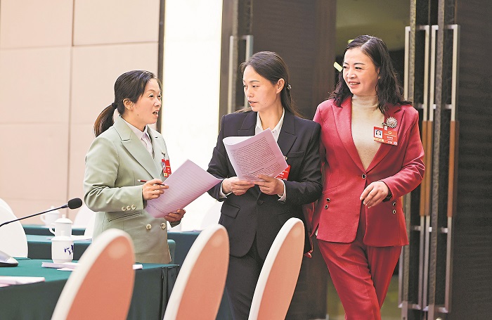 3月6日,在江西代表團(tuán)駐地,江西貫勝鞋業(yè)有限公司營銷部職員王花萍代表、九江鑫城紡織有限公司職工熊曉梅代表、九江市公共交通集團(tuán)公司公交駕駛員張海榮代表(從左至右)在會后交流討論。