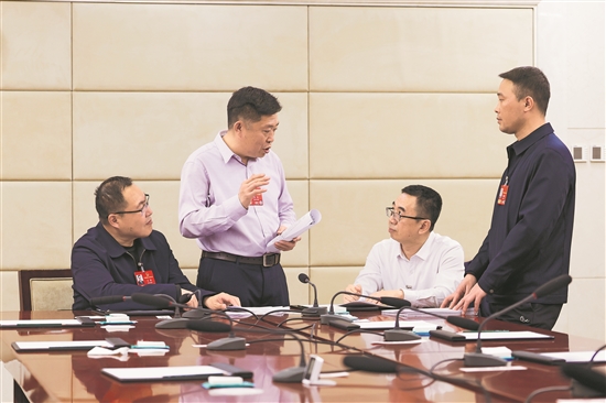 3月8日,在黑龍江代表團駐地,中車齊齊哈爾車輛有限公司中車首席技能專家王海代表、通用技術齊二機床公司馬恒昌小組組長馬兵代表、龍煤集團鶴崗礦業(yè)公司峻德煤礦機電副總工程師許曉林代表、哈爾濱紅光鍋爐集團環(huán)縫焊接組組長周曉龍代表(從左至右)就如何培育高技能人才建功“十五五”的話題進行了討論。他們都是全國勞動模范或全國五一勞動獎章獲得者,一直關注高技能人才的培育。