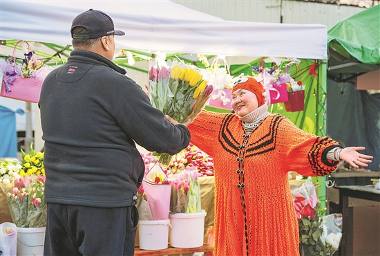 全球多地民眾近日選購鮮花,慶?!叭恕眹H婦女節(jié)。圖為近日在哈薩克斯坦阿拉木圖,一名女士接受獻花。