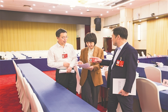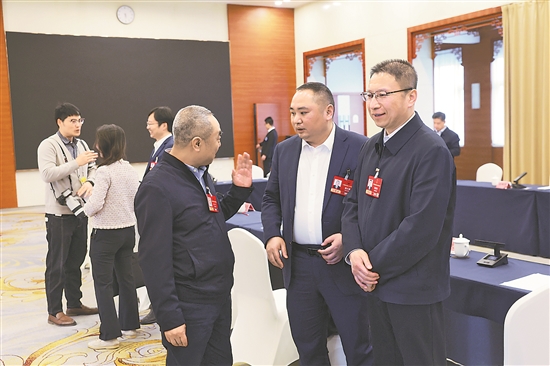 當日下午,重慶代表團小組討論結束后,重慶川儀調節(jié)閥有限公司高級技師劉平代表(前排左一)、重慶安保集團項目部副經理黃大勇代表(前排左二)和中國船舶集團首席技師傅國濤代表(前排右一)繼續(xù)就“立法保障勞動者權益”的話題交流討論。本報記者 吳凡 攝