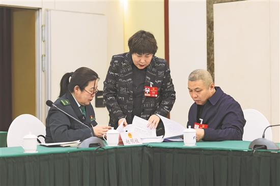 3月6日,在遼寧代表團(tuán)駐地,中國(guó)郵政集團(tuán)有限公司遼寧省大連市中山區(qū)寄遞事業(yè)部勝利橋普郵營(yíng)業(yè)部攬投員趙明枝代表、遼寧昌華印刷包裝有限公司質(zhì)檢員劉桂梅代表、沈陽(yáng)儀表科學(xué)研究院有限公司焊接高級(jí)技師王軍代表(從左至右)就“一線職工如何應(yīng)對(duì)AI技術(shù)所帶來(lái)的挑戰(zhàn)”進(jìn)行交流,建議相關(guān)部門(mén)出臺(tái)普惠政策,開(kāi)展免費(fèi)技能培訓(xùn),普及實(shí)用技術(shù)和政策,共享AI發(fā)展成果。本報(bào)記者 王偉偉 攝