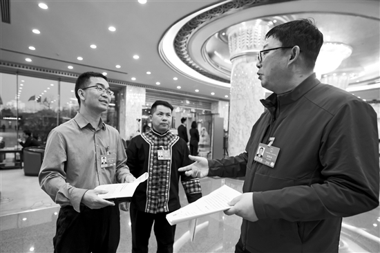 3月8日,烏江渡發(fā)電廠計劃發(fā)展部副主任鄭偉代表,中國郵政集團(tuán)有限公司貴州省龍里縣分公司投遞員莫富元代表,南方電網(wǎng)貴州銅仁供電局變電智能作業(yè)班副班長、二級拔尖專業(yè)技術(shù)專家周敬余代表(從左至右),正在圍繞貴州省的發(fā)展進(jìn)行交流。