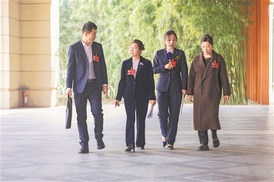 3月10日,在北京代表團駐地,中鐵六局豐橋公司石家莊項目部副經(jīng)理王足剛代表、石景山區(qū)環(huán)境衛(wèi)生服務(wù)中心密閉式清潔站操作員劉明群代表、北京市首都公路發(fā)展集團有限公司京開高速公路管理分公司青云店收費管理所收費班長王爭代表、北京七一八友晟電子有限公司質(zhì)量工程師管文會代表(從左至右)在前往會場時進行交流。