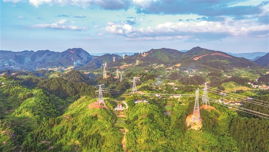②“疆電入渝”特高壓工程重慶段輸電線路翻越綿延群山。國(guó)網(wǎng)重慶市電力公司供圖