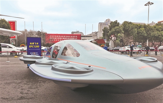 ④今年湖北“新春第一會(huì)”展示現(xiàn)代化“飛車(chē)”——全球首創(chuàng)全涵道式噸級(jí)“飛碟”電鷹飛車(chē)。本報(bào)記者 張翀 通訊員 周世瑋 攝