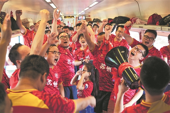 ①2025年夏天,“蘇超”爆火?!疤K超專列”上,球迷正齊聲吶喊助威。本報(bào)記者 劉金夢(mèng) 攝