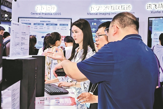 ③觀眾正參觀2025年世界人工智能大會(huì)期間展出的訊飛曉醫(yī)展品??拼笥嶏w集團(tuán)供圖