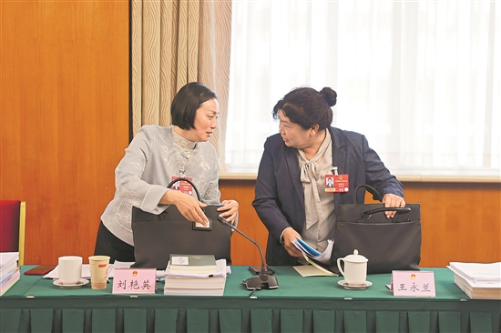 3月10日,四川省代表團小組討論結(jié)束后,安岳縣文化鎮(zhèn)隆恩村黨支部書記劉艷英代表(左)和米易縣普威鎮(zhèn)獨樹村黨總支書記王永蘭代表(右)就新就業(yè)群體權(quán)益保障問題交流討論。