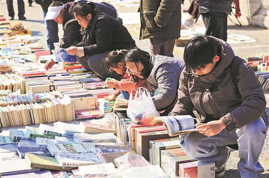 3月7日,江蘇淮安,市民在清江文廟舊書(shū)攤位前選購(gòu)書(shū)籍。
