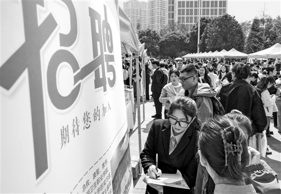 3月11日,求職者在招聘會現(xiàn)場填報求職信息。