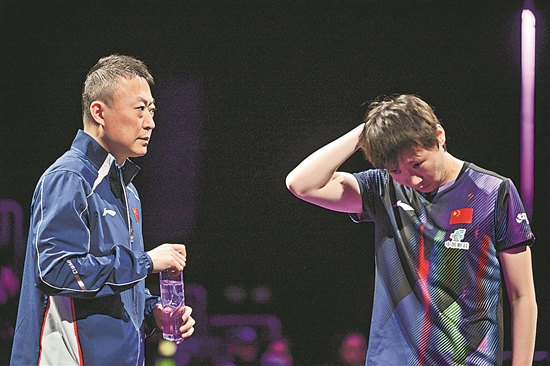 WTT重慶冠軍賽中,王曼昱(右)與教練馬琳在比賽間歇交流。新華社記者 陳誠(chéng) 攝