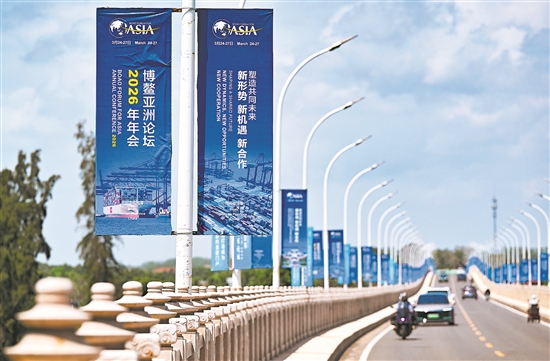 圖為博鰲大樂(lè)大橋上的博鰲亞洲論壇2026年年會(huì)主題宣傳牌(3月17日攝)。