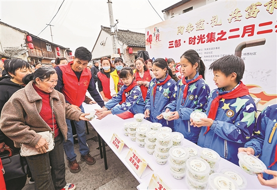 3月20日,小學(xué)生們在浙江省諸暨市陶朱街道三都老街春日共富市集上分送特色炒米飯。該市集融合文藝展演、便民服務(wù)、民俗體驗(yàn)、美食共享、非遺展示等多元內(nèi)容,打造春季文旅消費(fèi)場景,讓老街煥發(fā)新生機(jī)。