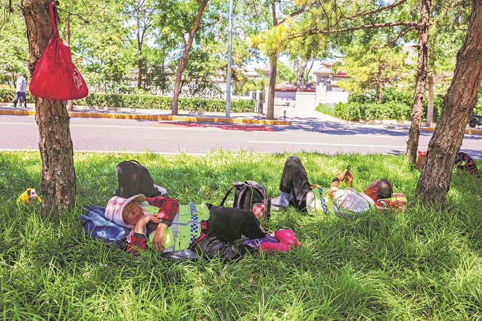 2025年6月2日午間,北京的一處綠化帶,園林工人正在樹蔭下乘涼休息。本報記者 王偉偉 攝