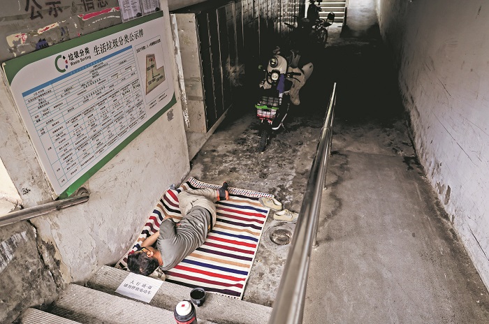 2025年8月12日,北京的一處老舊小區(qū)內(nèi),裝修工正在過道內(nèi)午休。本報記者 王偉偉 攝